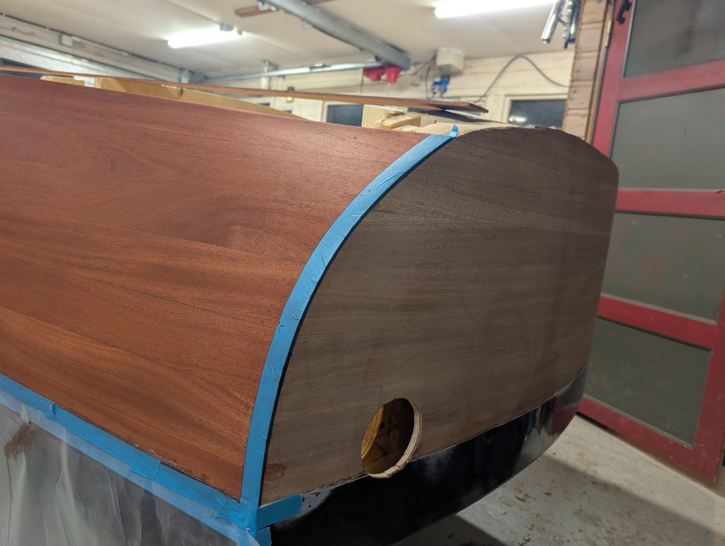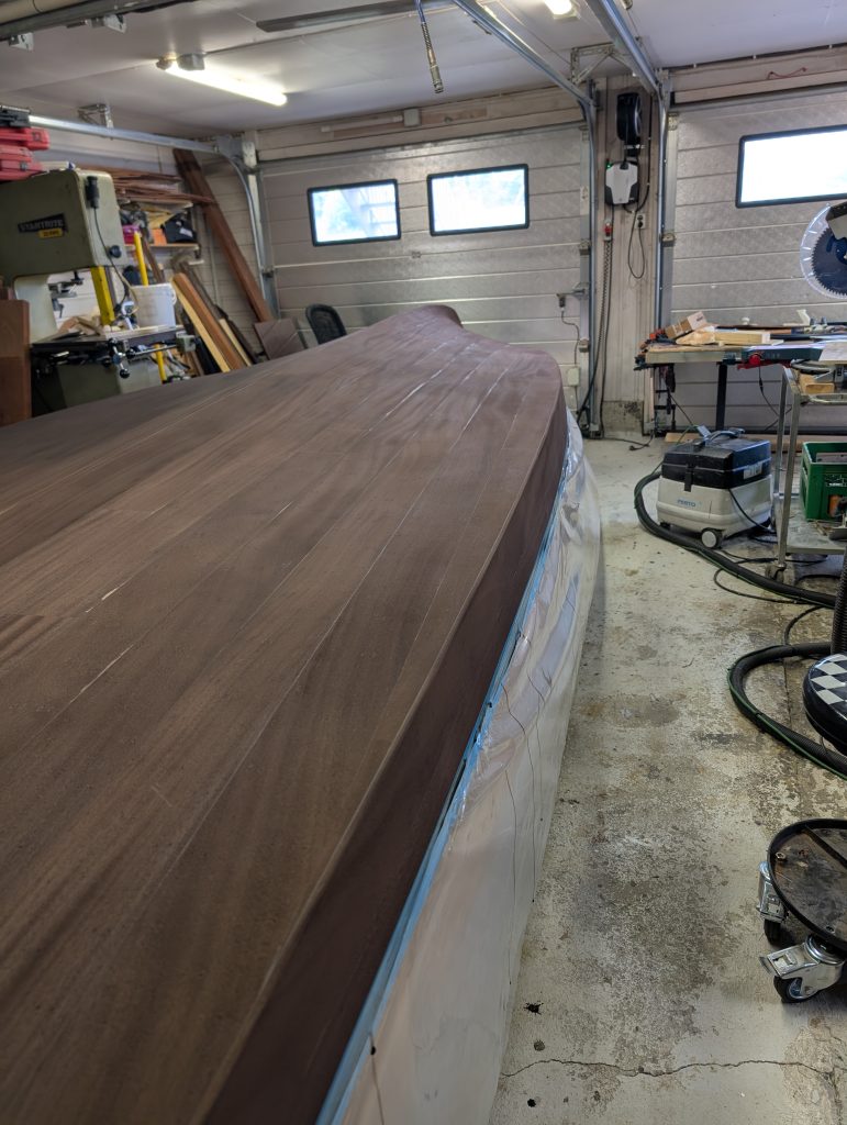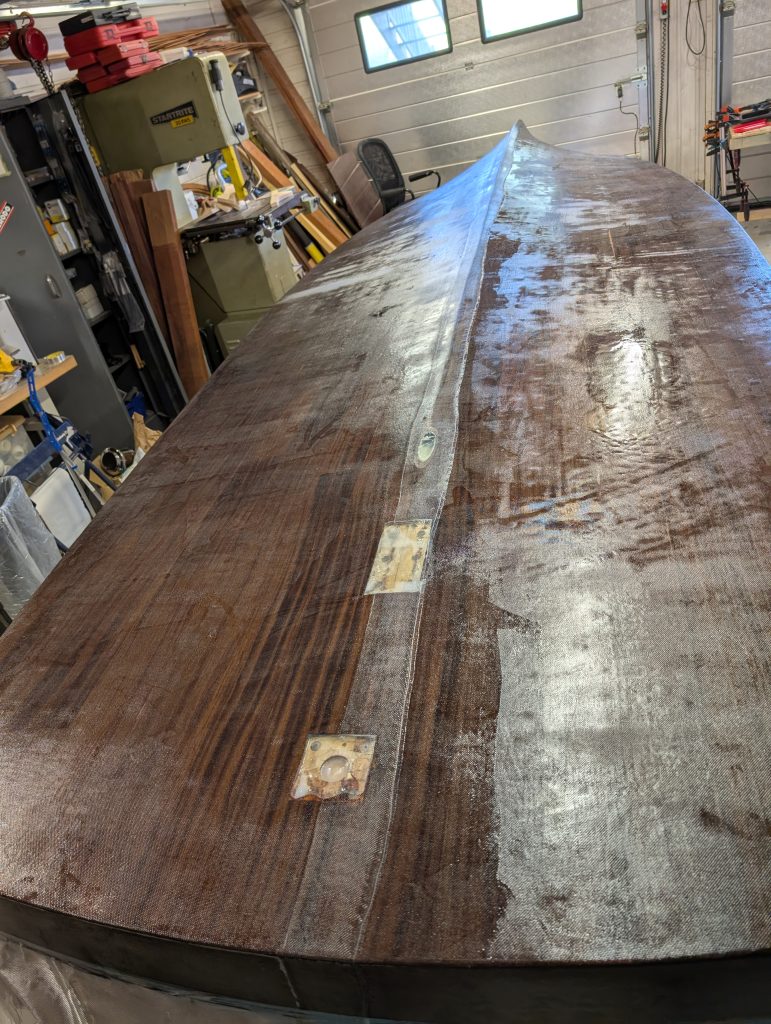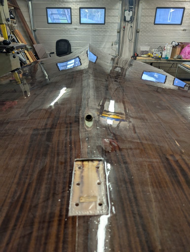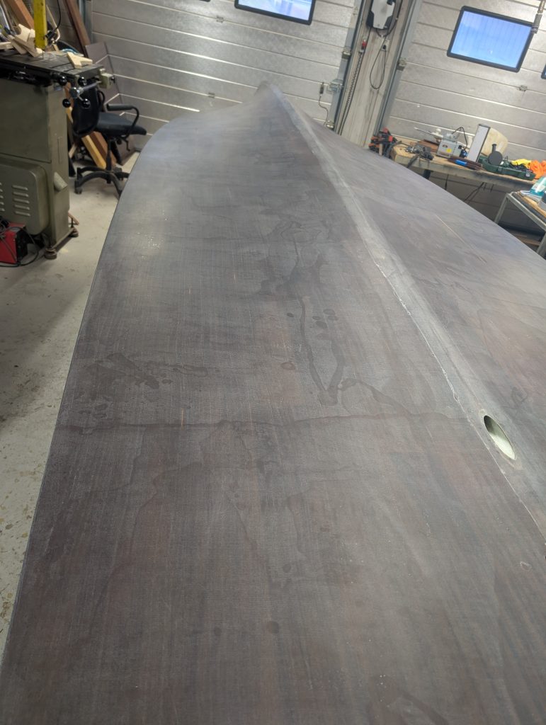 Nå gjelder det å renske opp i limrester etter limingen av første lag med kryssfiner, samt lett sliping før alt skal smøres med et par lag med epoxy som vil ha farge. Ennå uvisst hva denne blir.