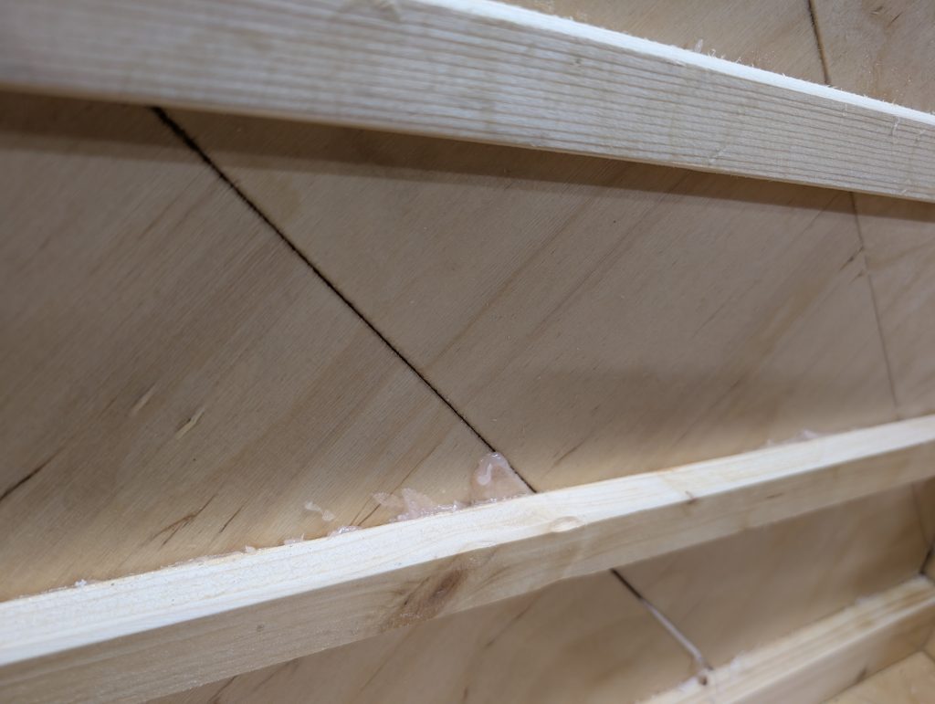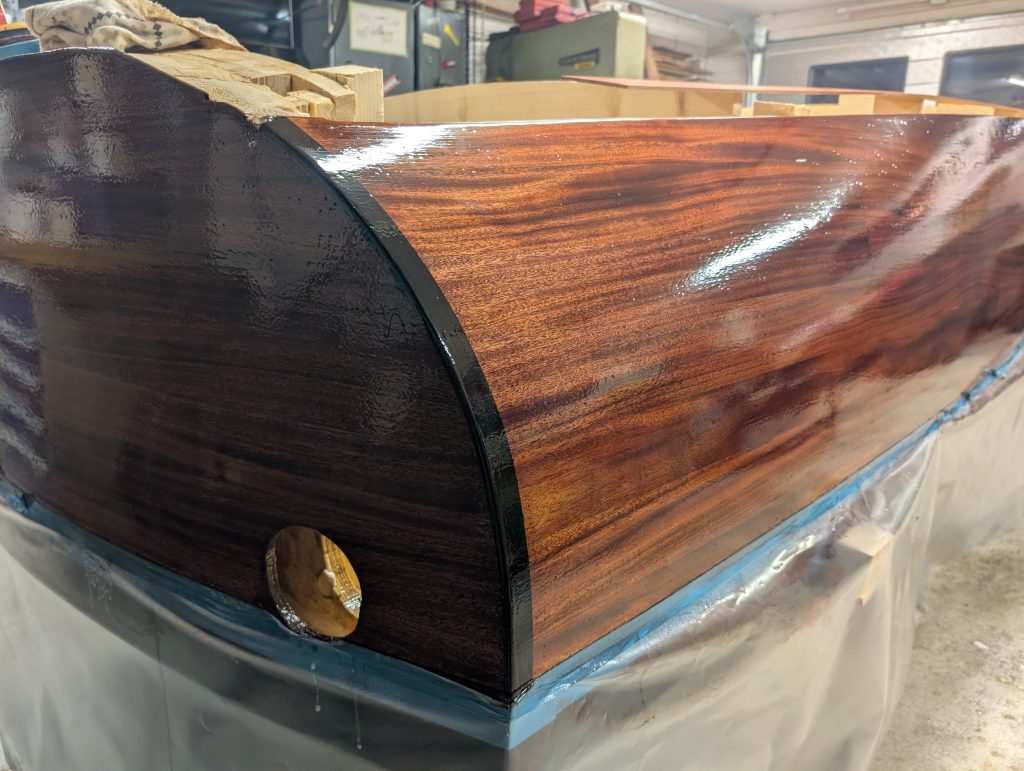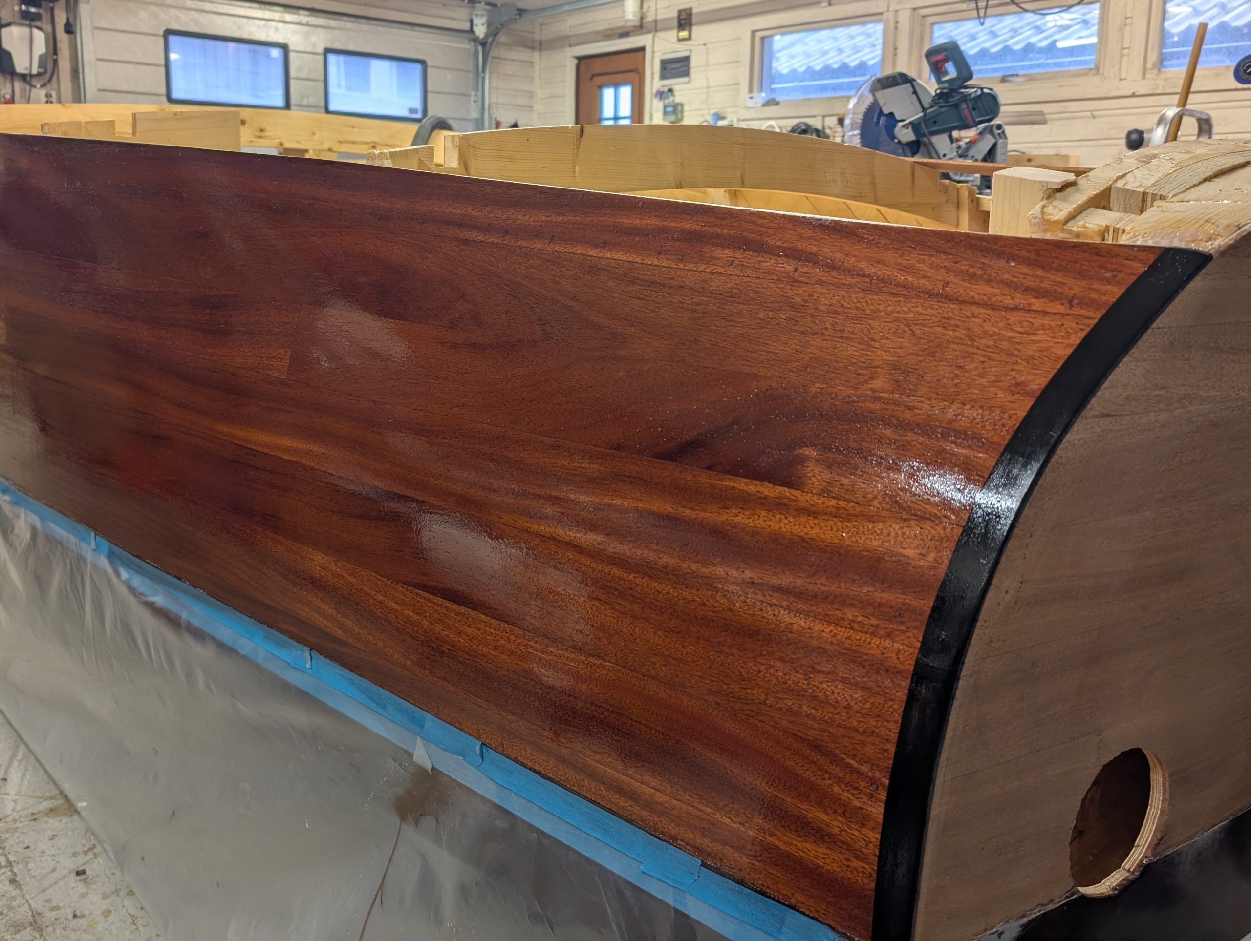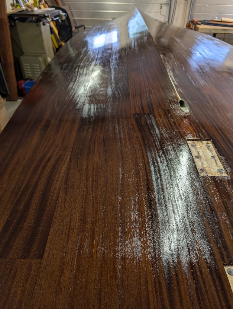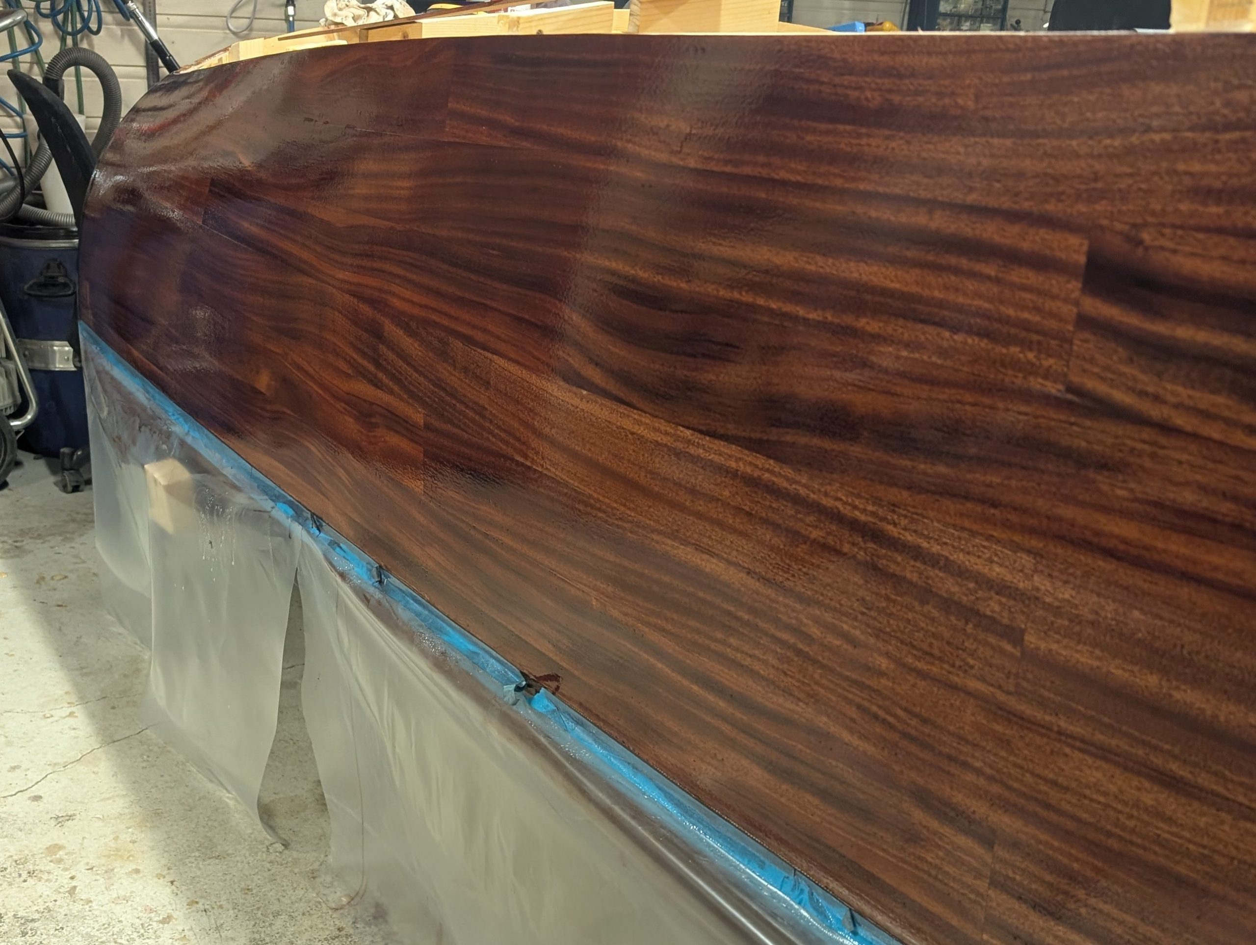 Nå gjelder det å renske opp i limrester etter limingen av første lag med kryssfiner, samt lett sliping før alt skal smøres med et par lag med epoxy som vil ha farge. Ennå uvisst hva denne blir.