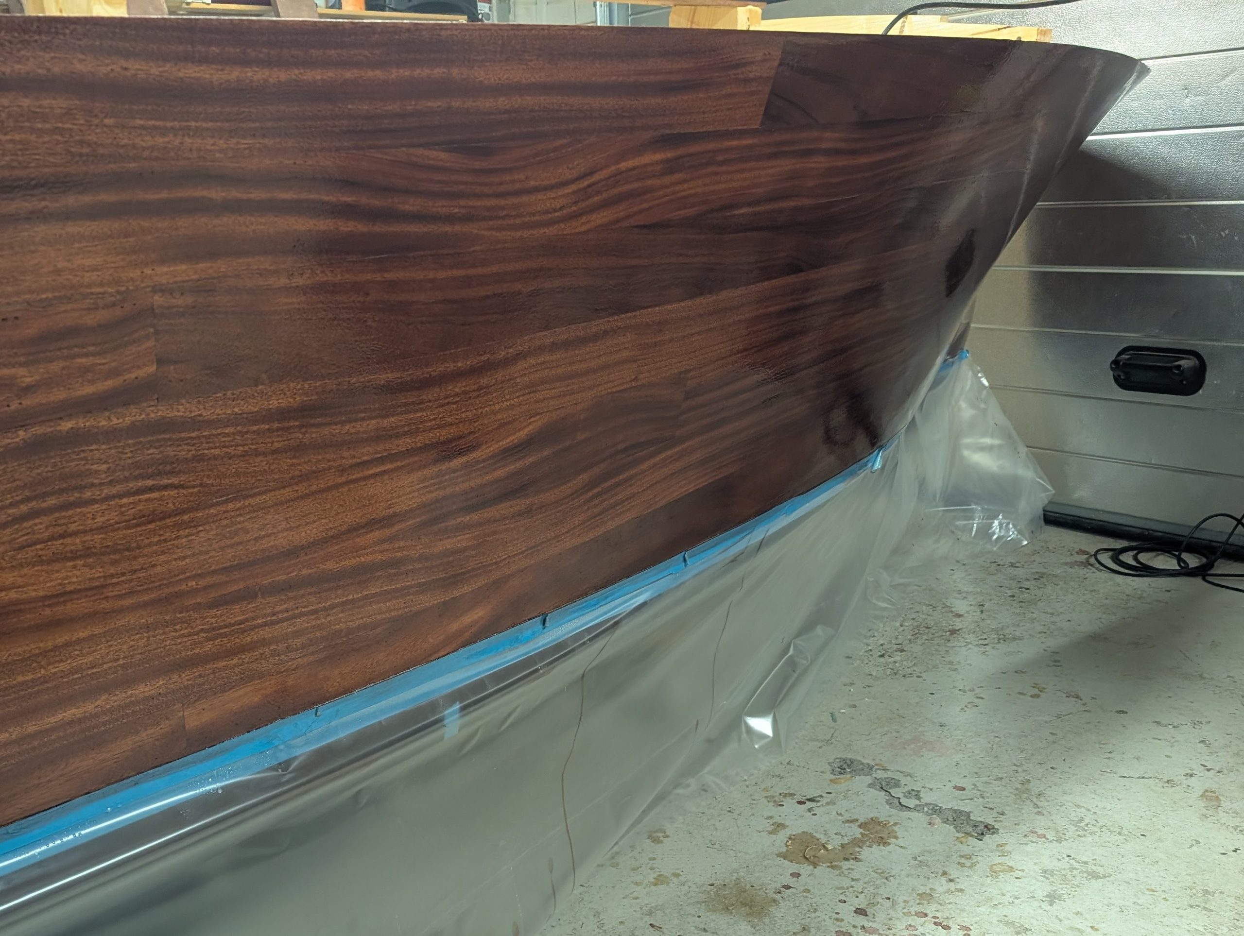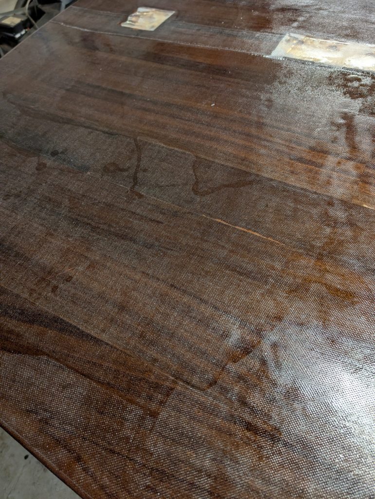 200 g/m² enkel vevd E-glassfiber lagt på og deretter smurt med epoxy, blir spennende å se hvordan slutt resultatet blir, er høyst usikker på hvor mye av glass fiberen som vil sees til slutt. Uansett så er dette fra vannlinja og ned.