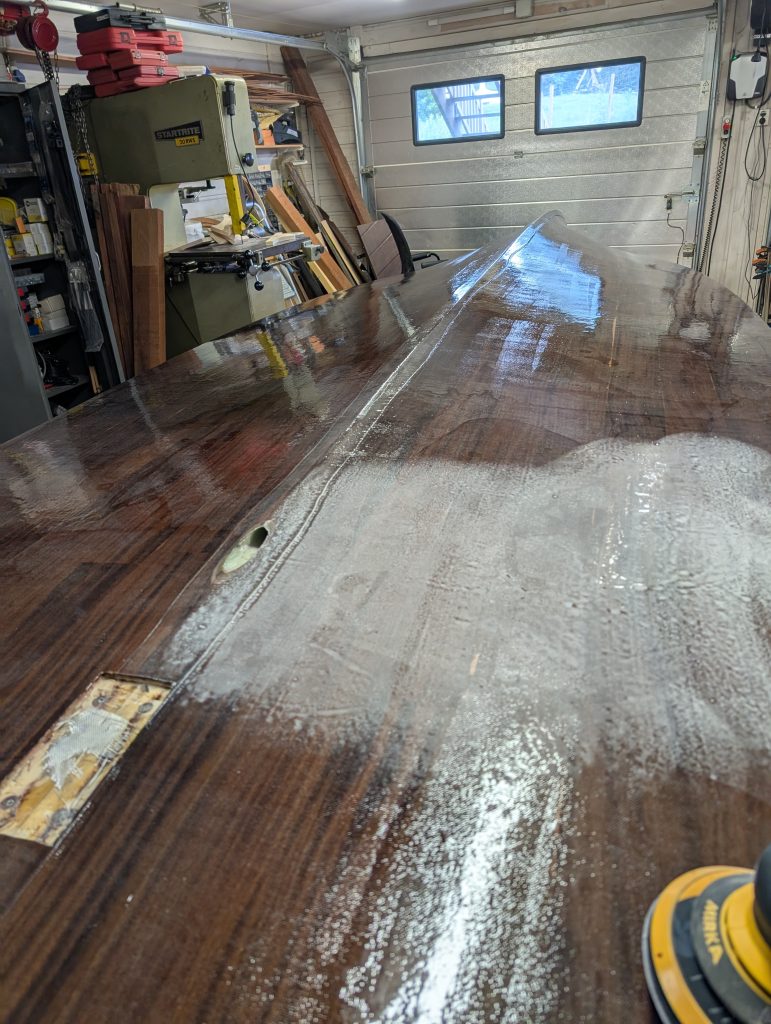 Etter å pusset ned mest mulig flatt uten å gå i gjennom glassfiber, er det lagt på ytterlig 2 Strøk med epoxy, som nå er slipt ned igjen, for å nå lakkere alt med utjevnings lakk (5 strøk) Epifanes PP Vanish Extra, som er en 2 komponent klarlakk. Sikkert unødvendig mye, men sånn blir det