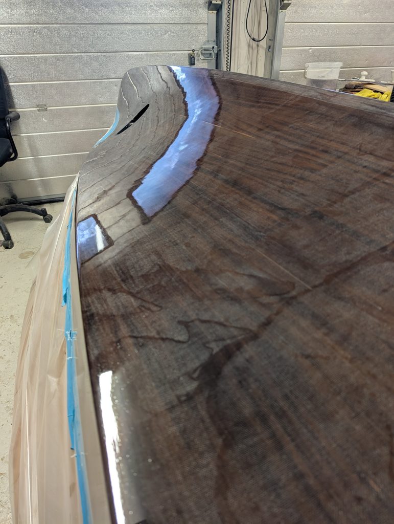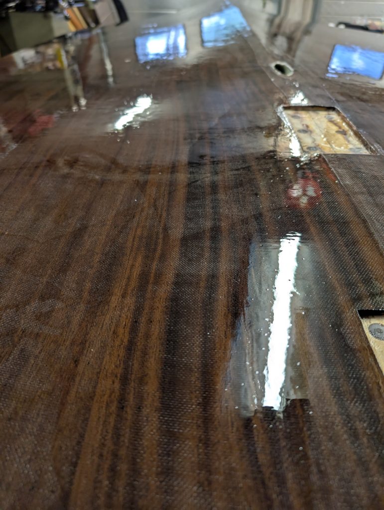 Her der rullet og penslet, 3 lag med West System 105 resin og 207 herder. Begynner virkelig å ane et slutt resultat nå.